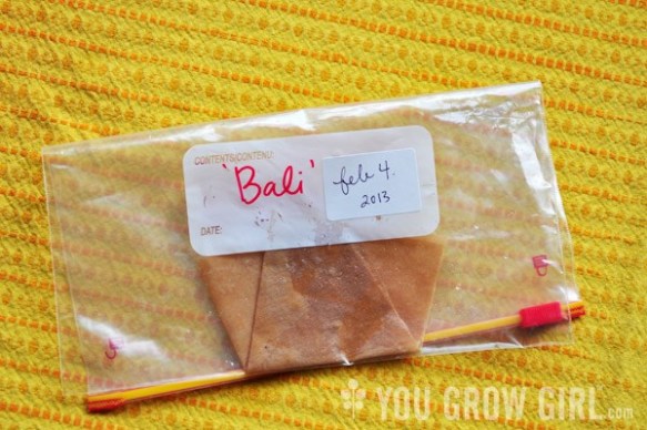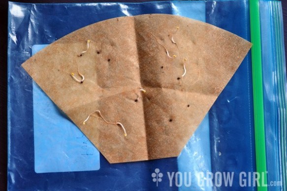Place the moist and folded coffee filter inside a baggie and seal. Write the variety name and the date you started the test on the outside of the baggie. I write this onto sticker labels so I can reuse the baggies in further testing.