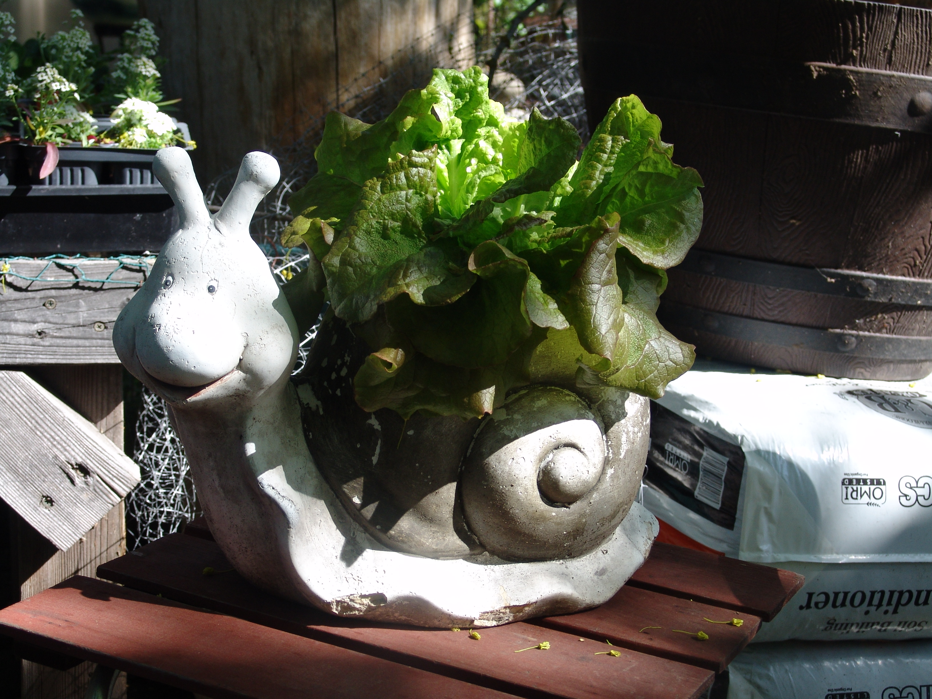 I hate slugs, Yes, I know that they have a purpose in the garden other than destroying your vegetables, but I really don’t want them in my lettuce. So far, I have suffered no slug damage to lettuce in pots.