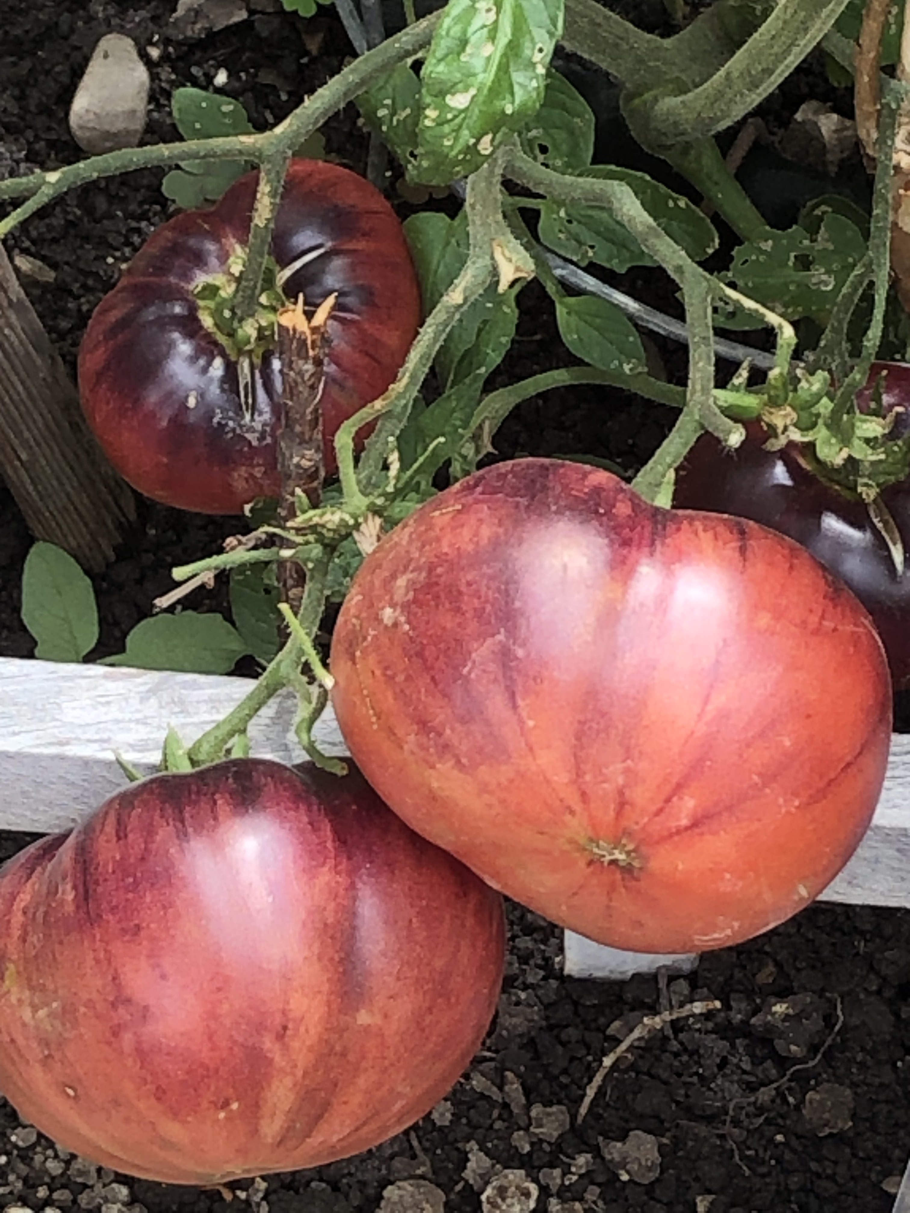 These tomatoes were part of my dark and unusual choices for this year. I was amazed at the size and coloring of the ‘Blue Beauty’. Very prolific, they all seemed to ripen at once (so far) and the plant isn’t too tall. Labeled as an indeterminate. A cross between ‘Beauty King’ and a blue tomato. This is a Brad Gates Introduction of Wild Boar Farm. He has come up with some doozies! His are the most colorful tomatoes around. It is also one of the first to ripen in my garden.